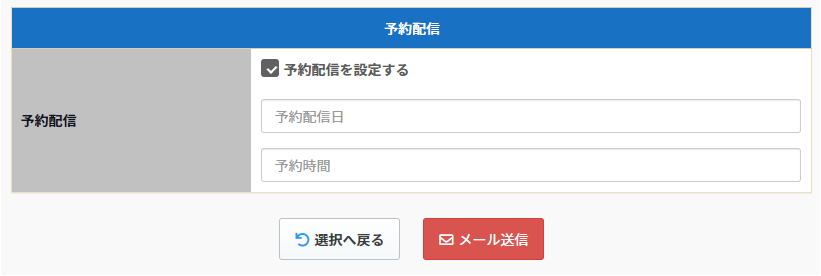 予約配信の設定方法についてご説明致します。予約配信の設定は通常のメールを送信する場合と同じように宛先を選択して「配信内容確認画面」までお進み下さい。