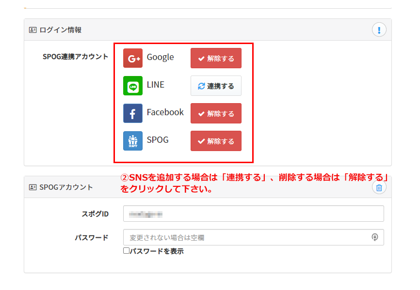 SNSを追加連携する場合は「連携する」、解除する場合は「解除する」 をクリックして下さい。「連携する」を選択された場合は各SNSのサイトへと移動致します。この際に各SNSでのログインが必要となります。各SNSのログイン情報につきましてSPOGでは保存は一切行っておりません。