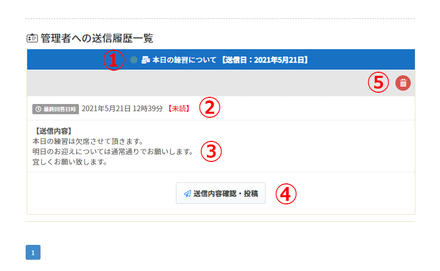 ⑤のボタンをクリックすると管理者への連絡を削除できます。削除しようとする管理者への連絡が既読でない場合は削除できませんのでご注意下さい。