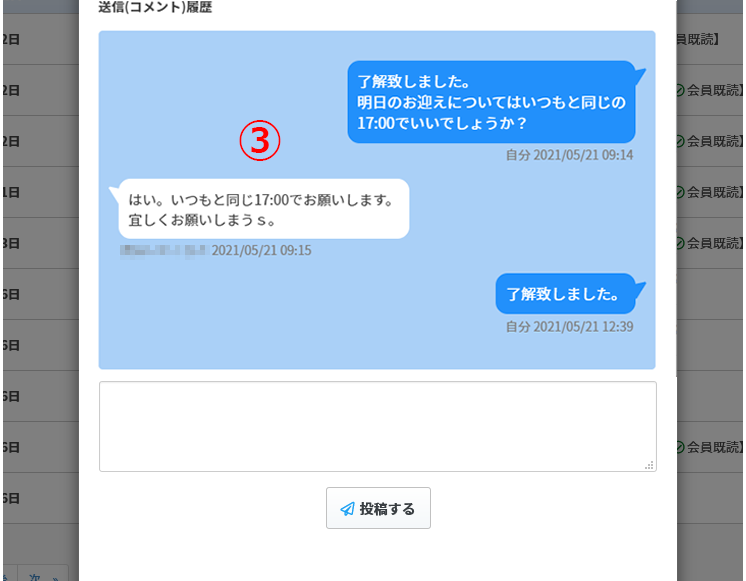 ③に投稿されたコメントが時系列順に表示されます。下に行くほど新しいコメントとなります。