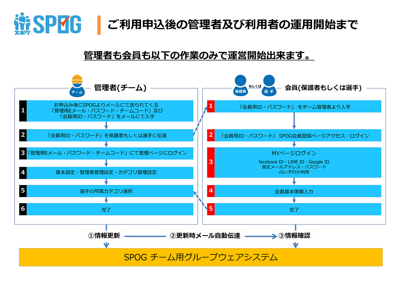 お申込後の流れは管理者(チーム)の方は5ステップで、会員(保護者もしくは選手)の方は4ステップで運営を開始頂けます。
