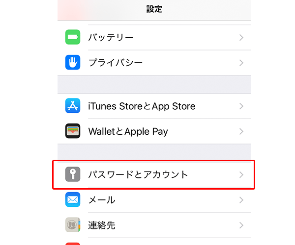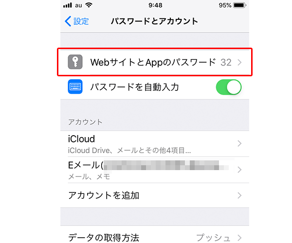 設定メニューの「WebサイトとAPPのパスワード」をタップします。パスコードに入力が求められますので、Touch IDもしくはパスコードを入力します。