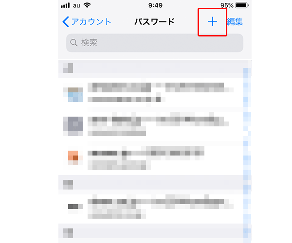 パスコードを入力すると、保存をしているパスワードの一覧が表示されます。新規でWEBサイトを登録する場合は、「+」をタップして下さい。
