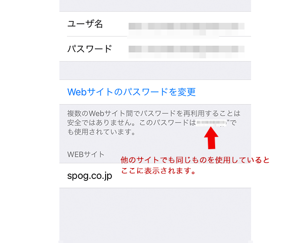 パスワードを編集する場合は、登録してあるサイトのアイコンもしくはURLをタップします。同じパスワードが別のWEBサイトで使用されている場合は、矢印の部分に表示されますので、ご確認下さい。