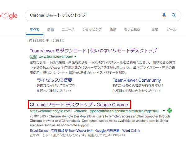 次に、Chromeリモートデスクトップを検索して下さい。検索結果の「Chromeリモートデスクトップ」をクリックして次に進みます。