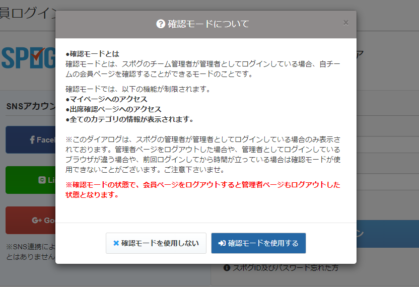 ※このダイアログは、スポグの管理者が管理者としてログインしている場合のみ表示されております。管理者ページをログアウトした場合や、管理者としてログインしているブラウザが違う場合や、前回ログインしてから時間が立っている場合は確認モードが使用できないことがございます。ご注意下さいませ。