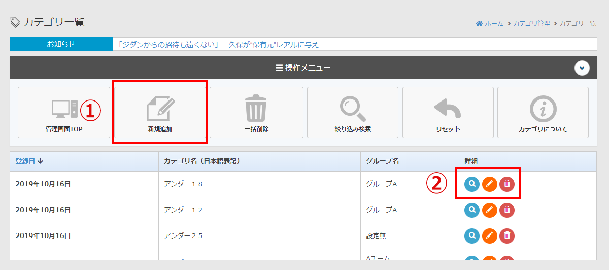 ①の「新規追加」をクリックすると、カテゴリの新規追加ができます。