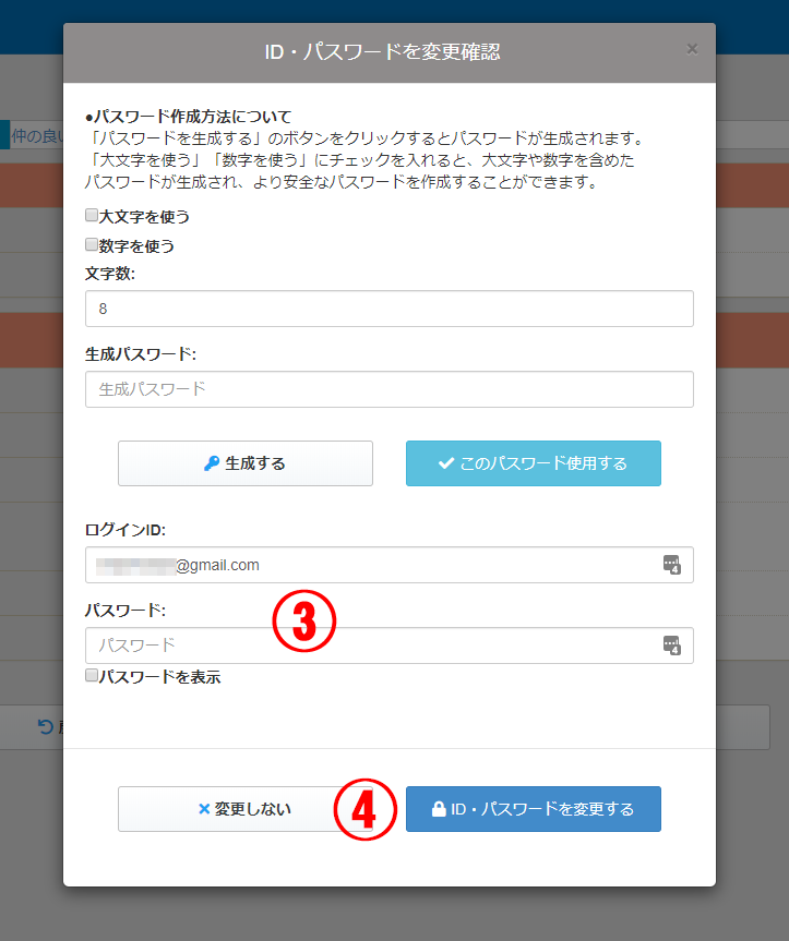 ③のログインIDとパスワードを変更して④の「ID・パスワードを変更する」をクリックするとIDとパスワードを変更することができます。パスワードを変更しない場合はパスワードの部分を「空白」にして下さい。