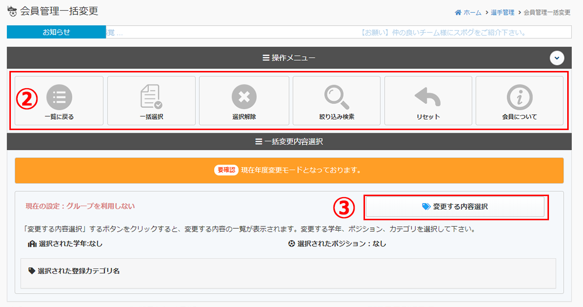 年度変更モードは、通常の一括変更の操作方法と同じです。②の操作メニューで選手の「一括選択」や「絞り込み検索」を行うことができます。