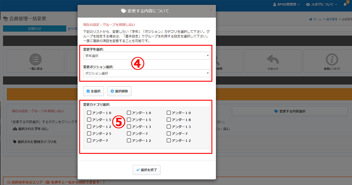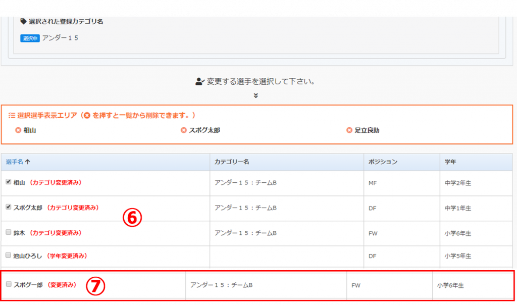 予め変更する選手のカテゴリや学年が決まっている場合は、絞り込み検索を行って下さい。