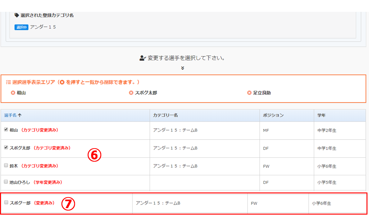 年度変更モードでは、カテゴリを変更すると「カテゴリ変更済み」学年を変更すると「学年変更済み」の文言が選手名の後に追加されます。